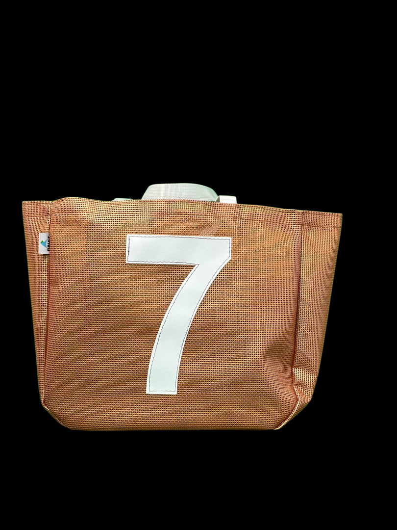Sac orange avec un "7" blanc.